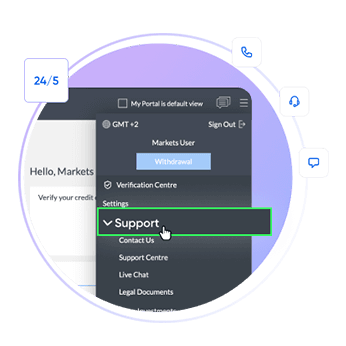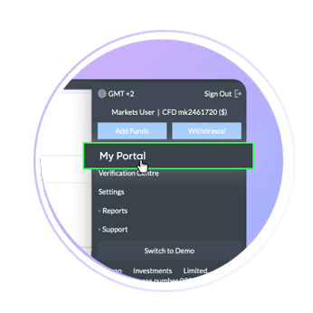 Sur la plateforme markets.com, sélectionnez « Mon portail » dans le menu déroulant ≡ en haut à droite de votre suite de trading