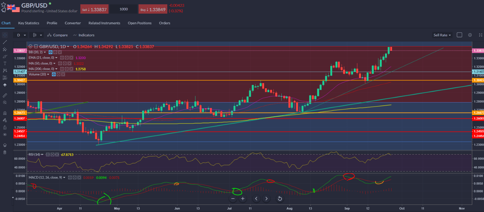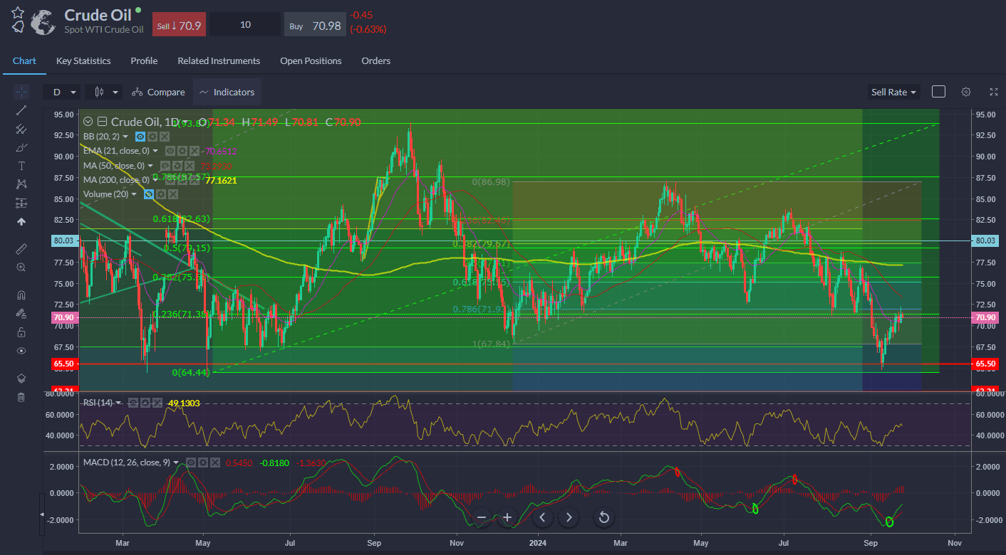 Spot WTI – struggling to best the Fib resistance levels in the $71-72 area for now. MACD bullish crossover but looking still for confirmation it’s firmly cleared the 21-day EMA.
